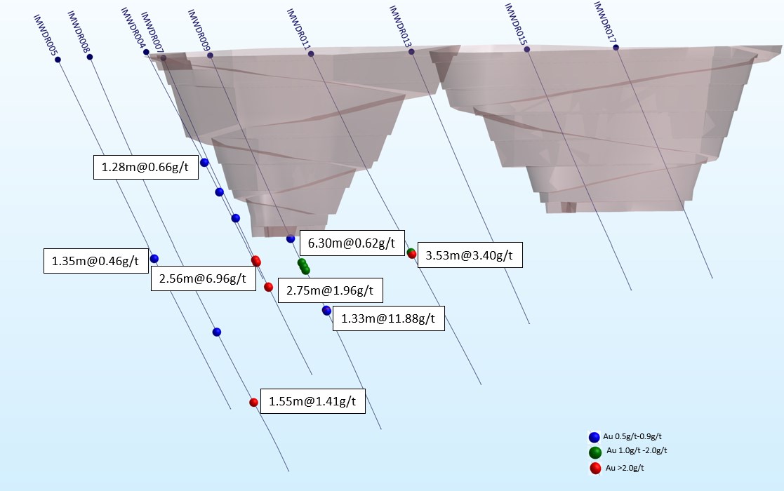 | IMWDR_009 | 378123 | 9679140 | 1180 | 190 | -60 | 228.80 | Included above | 170.40 | 170.62 | 0.22 | 68.74 | 15.12 | |