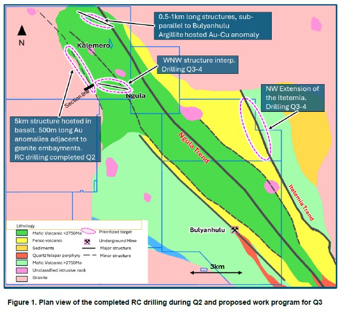 Exploration during Q2 2025 was focussed on testing with reverse circulation (RC) drilling the granite-greenstone contact in the northwest, interpreted to be prospective, and developing and planning an aircore (AC) drilling plan aimed at testing prospective areas considered to have a similar stratigraphic sequence to Bulyanhulu Mine, and a RC drilling program to test geochemical anomalies identified in previous AC drilling programs.